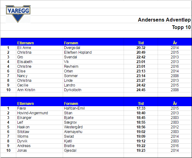 Andreas Bratlie var dagens raskeste løper. Vareggløperen ble klokket inn på 19:22. Tiden står seg til en 9. plass på Andersens 10-på-topp-liste. Bak Andreas stormet unggutten Markus Kjærner-Semb inn til 19:45. Børge B. Larsson kapret tredjeplassen med 19:55.
